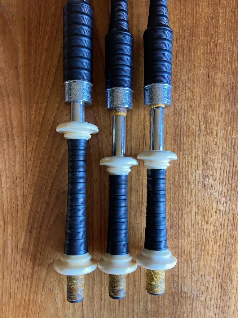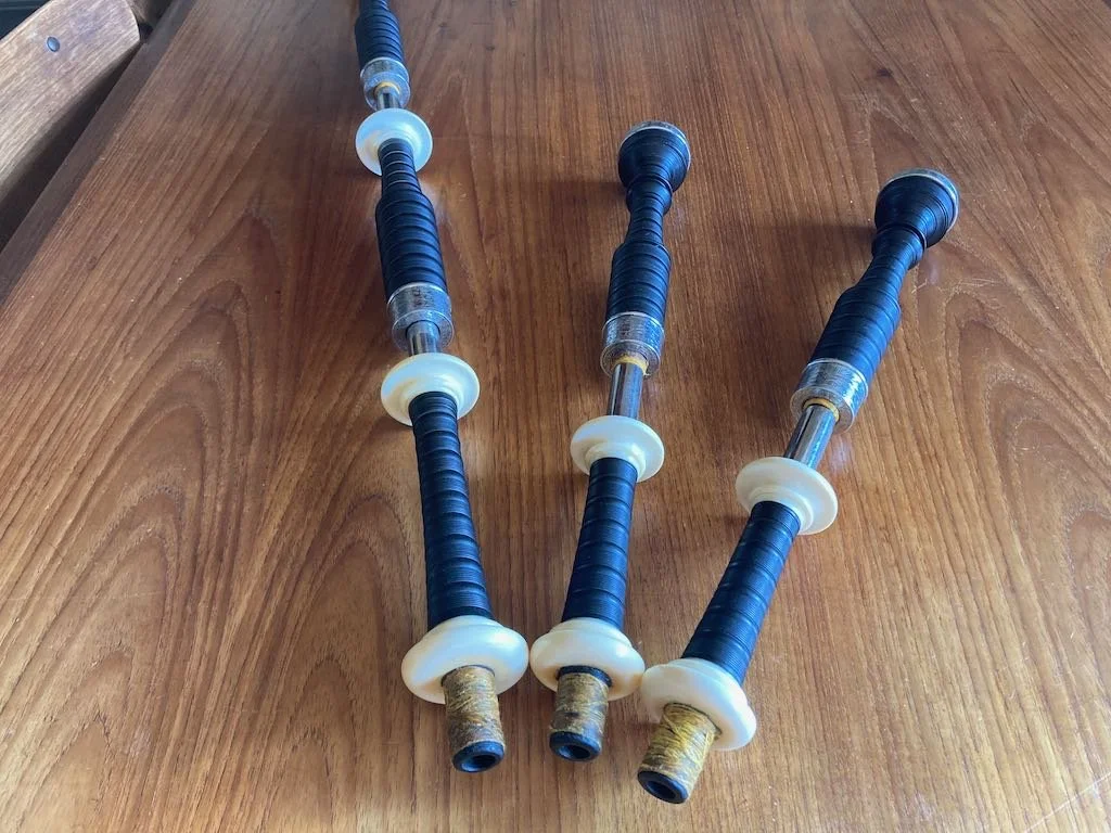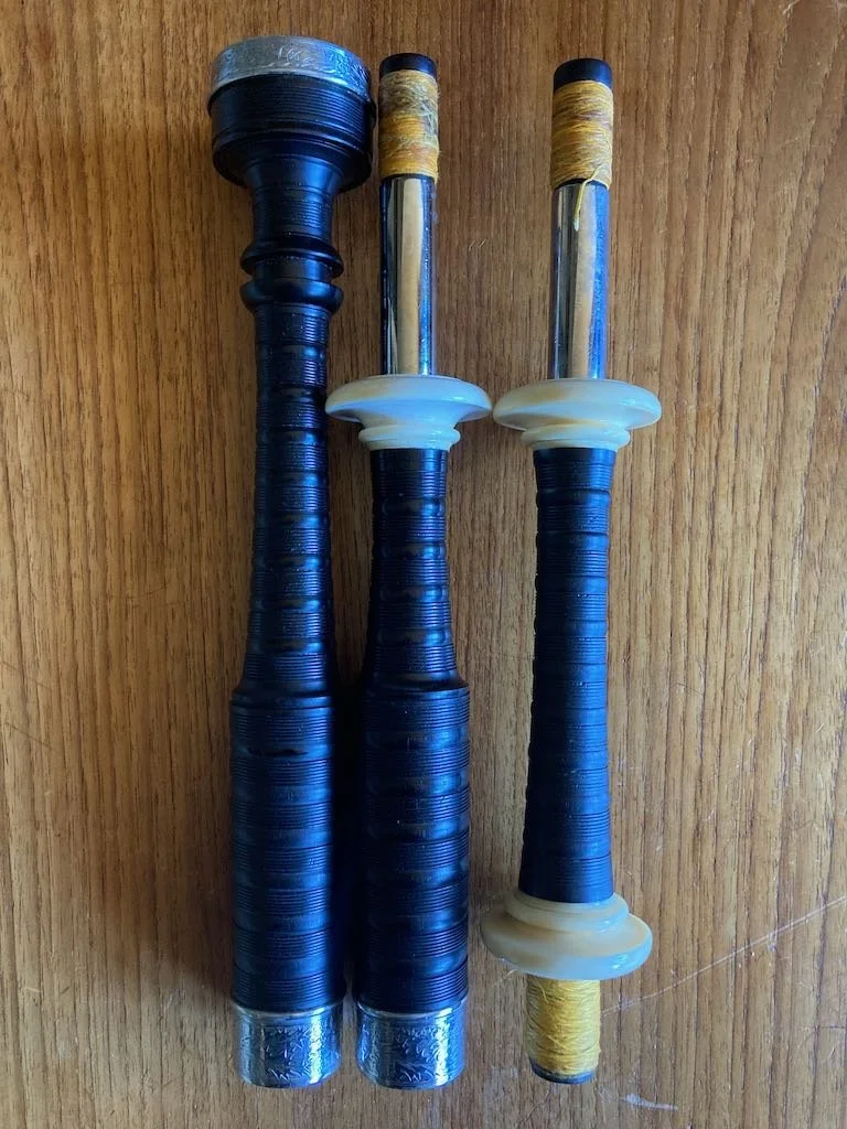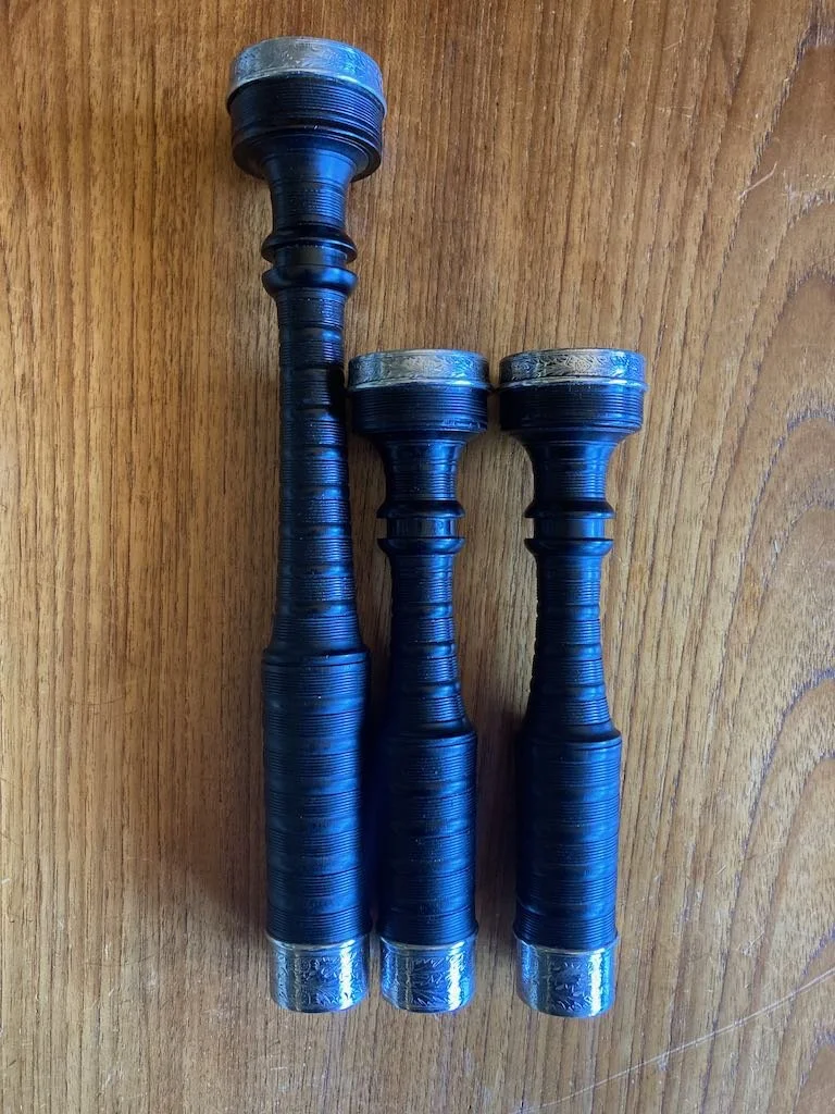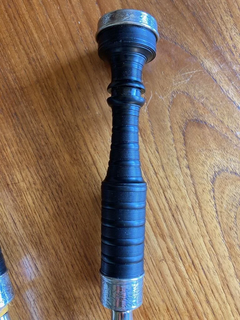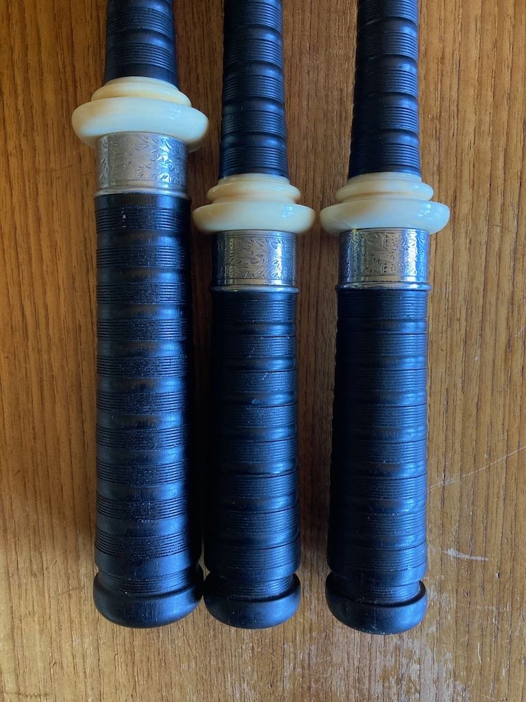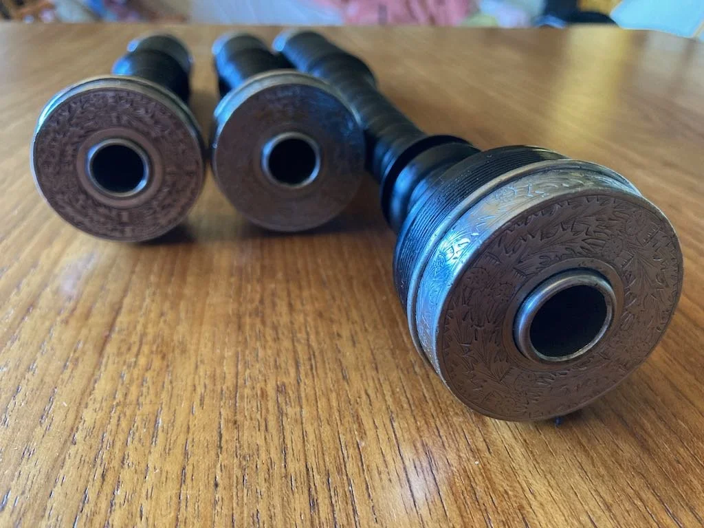 An extremely rare bagpipe owned by the noted prize winner and composer DC Mathers. This bagpipe is in very good condition but due to it’s age I would be hesitant to make this an everyday playing bagpipe. Unfortunately the ebony is prone to crack so this bagpipe must be babied for it to live another 150 years. Interestingly the metalwork is etched brass with silver plating: exquisite work that’s for sure. Hemp stops and slides added by Murray Huggins. He also repaired cracks and replaced the bass mid-joint that had cracked.